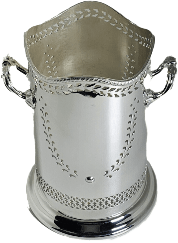 A silver plate syphon stand is a type of holder for a glass bottle that originally contained carbonated water or soda. Syphons were popular in the 19th and early 20th centuries as a way of dispensing fizzy drinks at home or in bars. A syphon stand is usually made of metal, often silver or silver plated, and has a circular opening at the top to fit the base of the bottle. The stand may have handles, feet, or a pedestal to make it easier to carry or display. The stand may also have decorative features, such as piercing, engraving, or motifs.