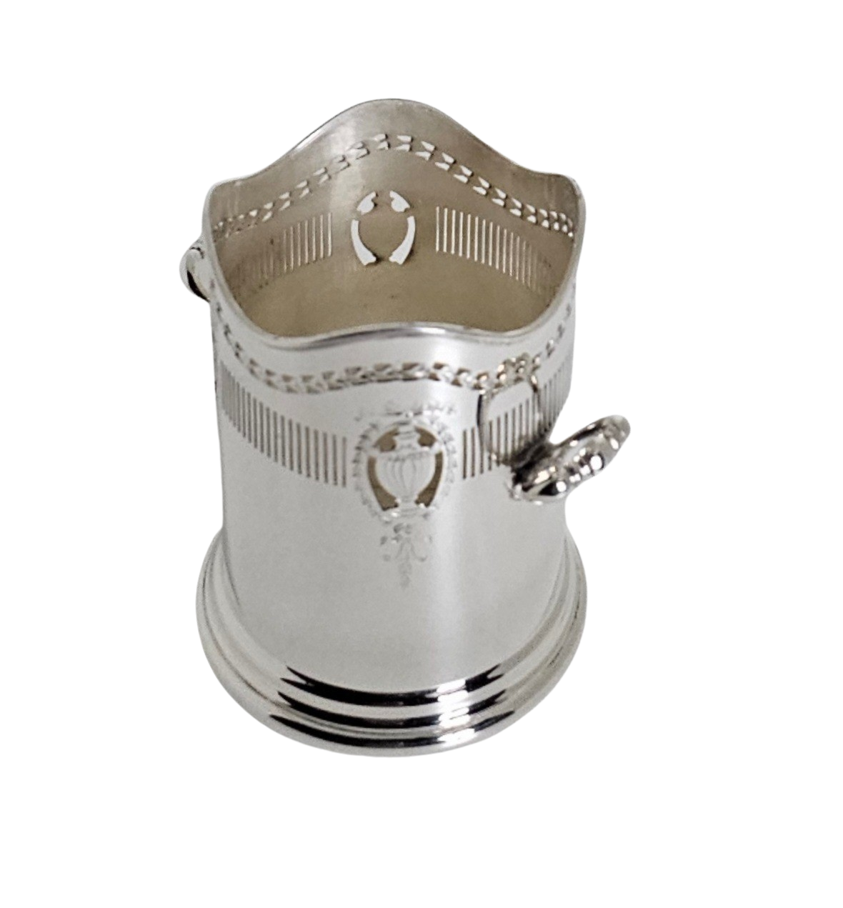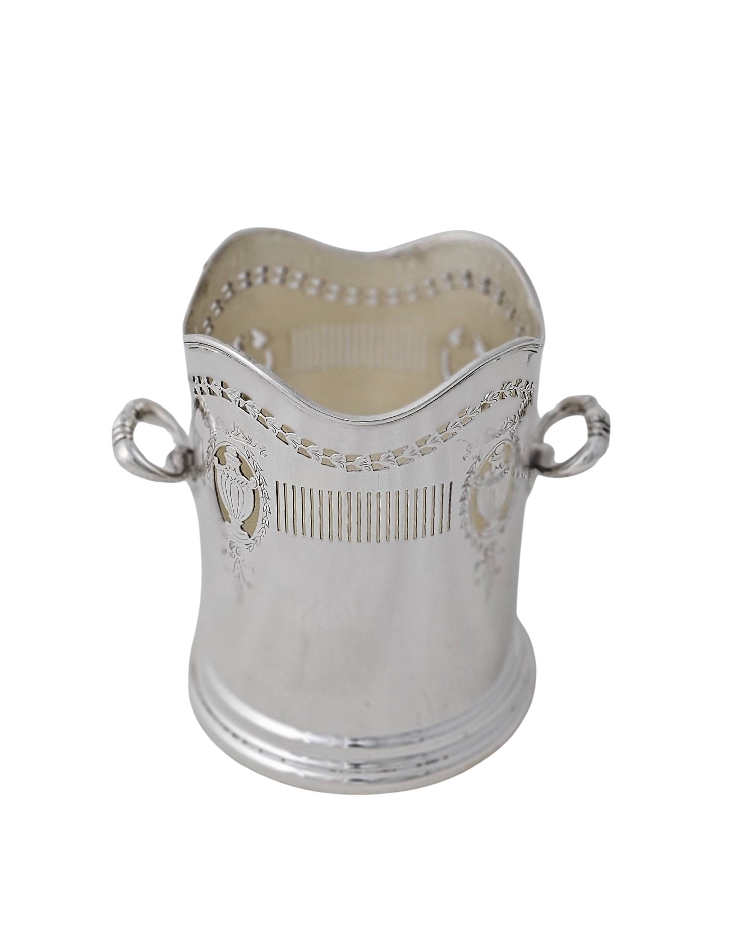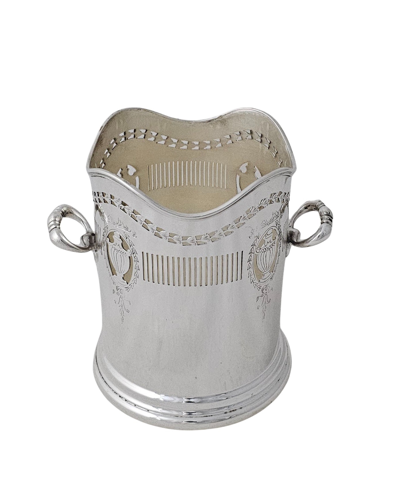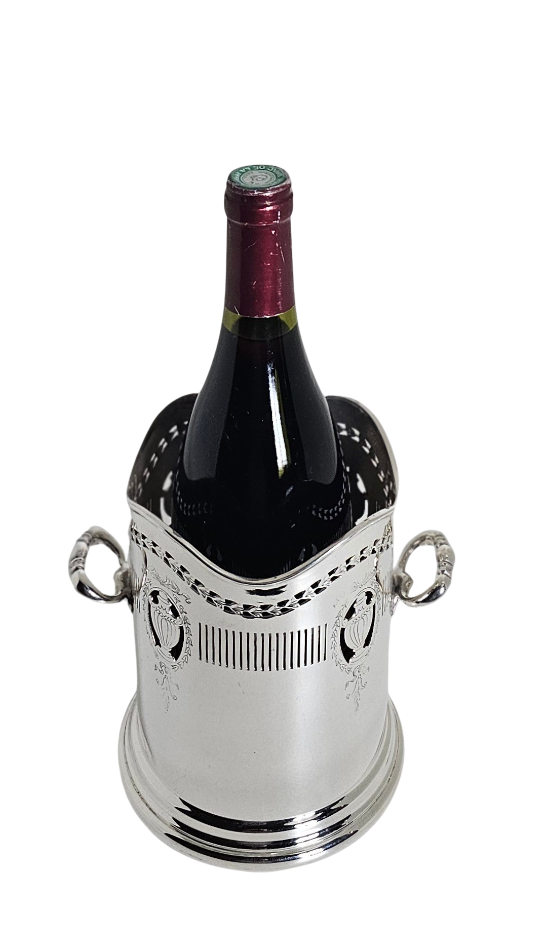 Syphon Stand (Pierced) Used as a Wine Bottle Stand Description: This superb silver-plated syphon stand features intricate hand-pierced patterns, making it a delightful addition to your collection. Dimensions: Approximately 7inches wide (including handles) and 6 inches high. Takes Bottle 4.5" wide. Functionality: Originally designed for syphons (devices used to carbonate water), this stand now serves as a unique wine bottle holder. The pierced design allows light to play through, adding visual interest. pristine condition. Provenance: Imagine the occasions when this stand graced elegant dining tables or adorned sideboards.