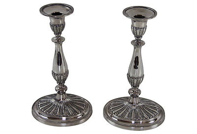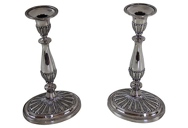 Pair Oval Feather Candlesticks, Silver Plate c.. SKU #: ANT5394.