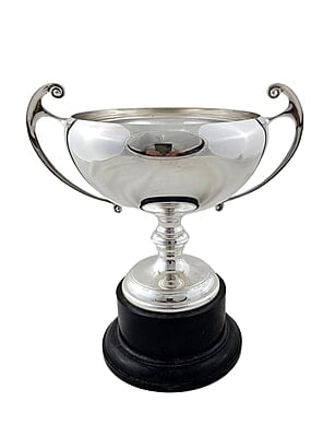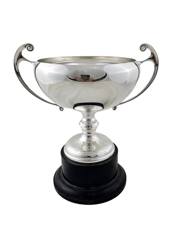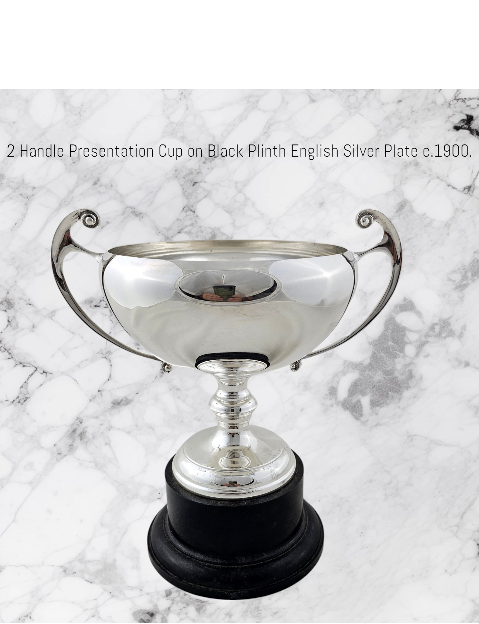 Antique Two-Handled Presentation Cup on Black Plinth This elegant two-handled presentation cup, crafted in English silver plate, dates back to circa 1900. The cup itself measures 7.5 inches in height, with a total height of 10.25 inches including the black plinth. The piece features a diameter of 9.25 inches (including the handles), with a width of 7.25 inches. A true testament to timeless craftsmanship, this stunning antique makes a perfect addition to any collection or display.