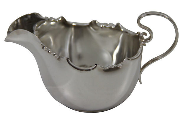 Cream jug with crimped edge motif. Made in England of silverplate, circa 1895.