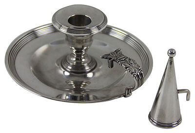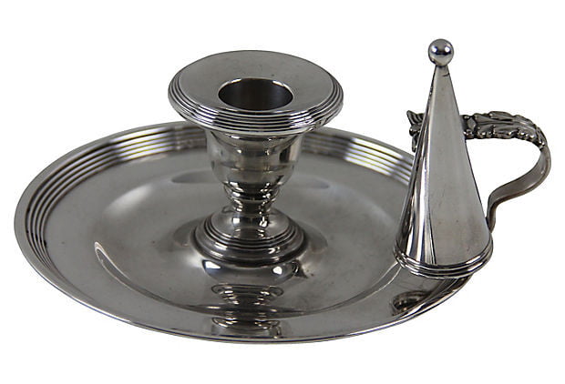 Silver-plate chamberstick and snuffer. The finger loop is decorated with leaves and a flat bee. Made in England circa 1895.