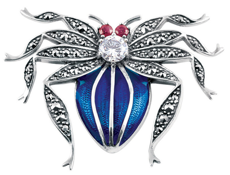 Brooch Spider Blue Enamel, Clear & Red Crystal & Mascasite Set English Sterling Silver 1 1/4" x ...