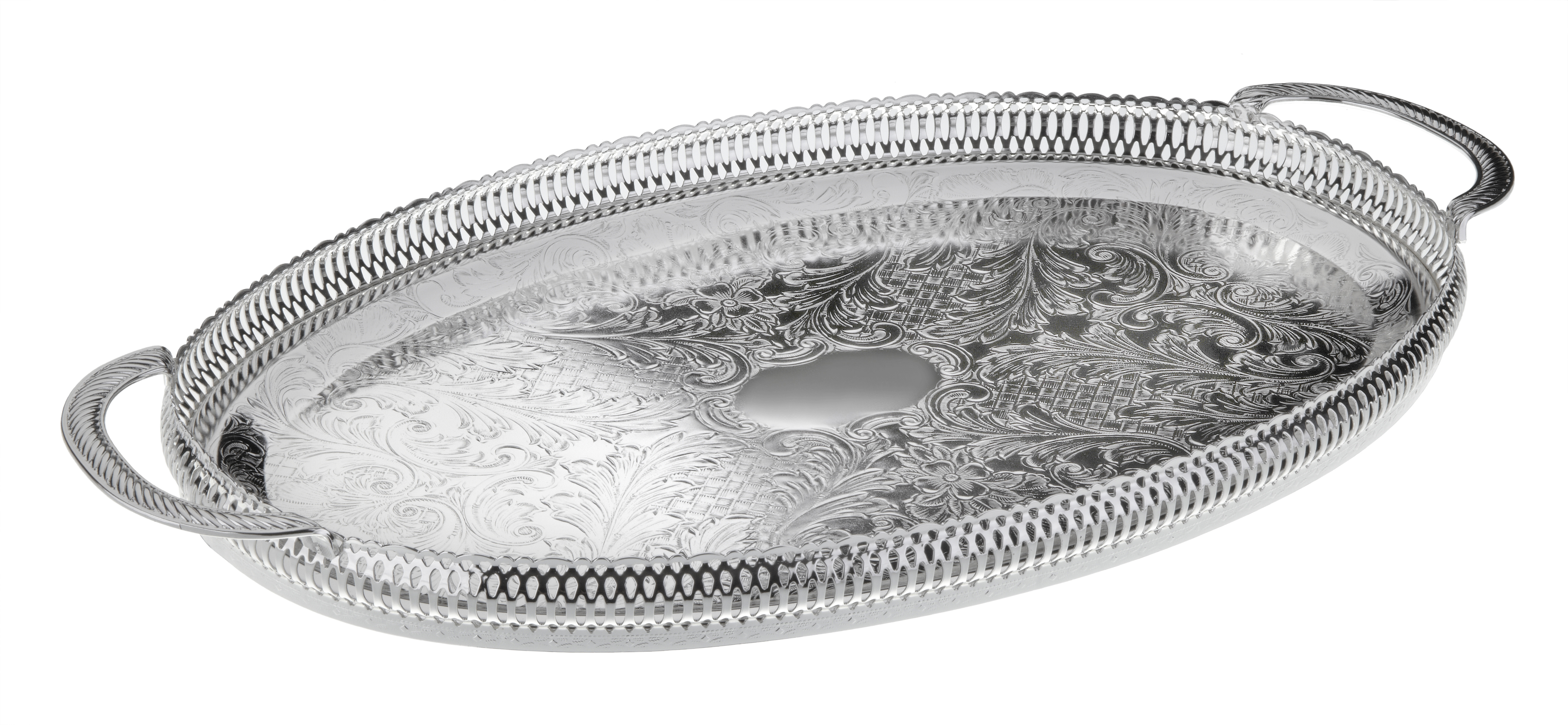 Queen Anne Oval Tray/Handles 1 1/2"h x 10"w x 17 3/4"l English Silver Plate (Tarnish Resistant). SKU #: 0/6332.