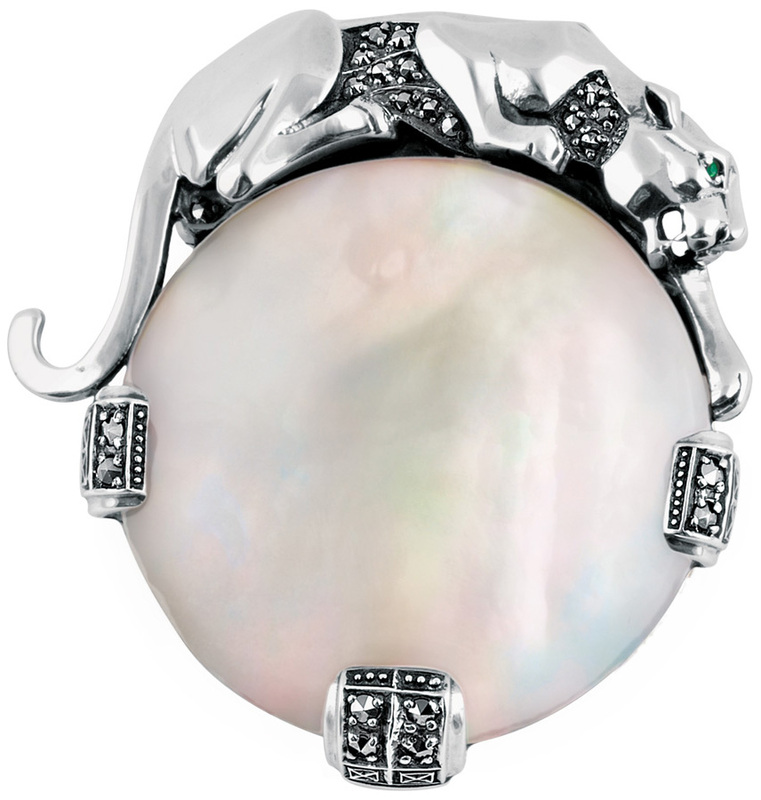 Brooch Panther Design Mother of Pearl, Marcasite and Emerald Set English Sterling Silver 2 1/8" ...