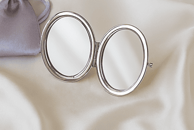 English Pewter Round Compact – Dual Mirror with Push-Button Closure Crafted in radiant English pewter, this round compact mirror blends heritage charm with modern functionality. Its smooth, polished casing opens effortlessly with a discreet push-button clasp, revealing two pristine mirrors—one standard and one magnified—designed for refined touch-ups and everyday elegance. Material: Hand-finished English pewter Design: Sleek round silhouette with dual mirrors Functionality: Push-button closure for ease and security Interior: One standard mirror and one magnified mirror Presentation: Nestled in a velvet-lined gift box for timeless appeal Ideal for: Seasonal gifting, travel, and personal refinement Whether tucked into a handbag or presented as a keepsake, this compact mirror is a celebration of craftsmanship and grace. A thoughtful gift for collectors, connoisseurs, or anyone who appreciates the art of personal presentation.