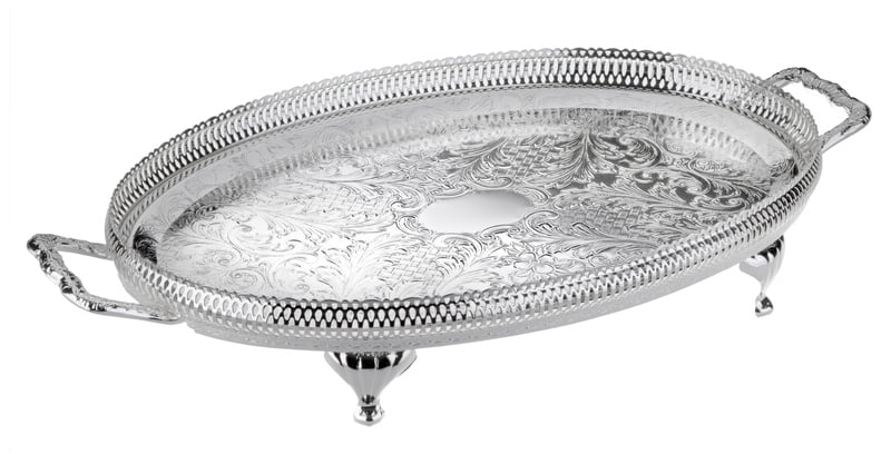 Queen Anne Oval Gallery Tray with Handles/Legs 2 7/8"h x 10" w x 18 1/2"l English Silver Plate (Tarnish Resistant). SKU #: 0/6333.
