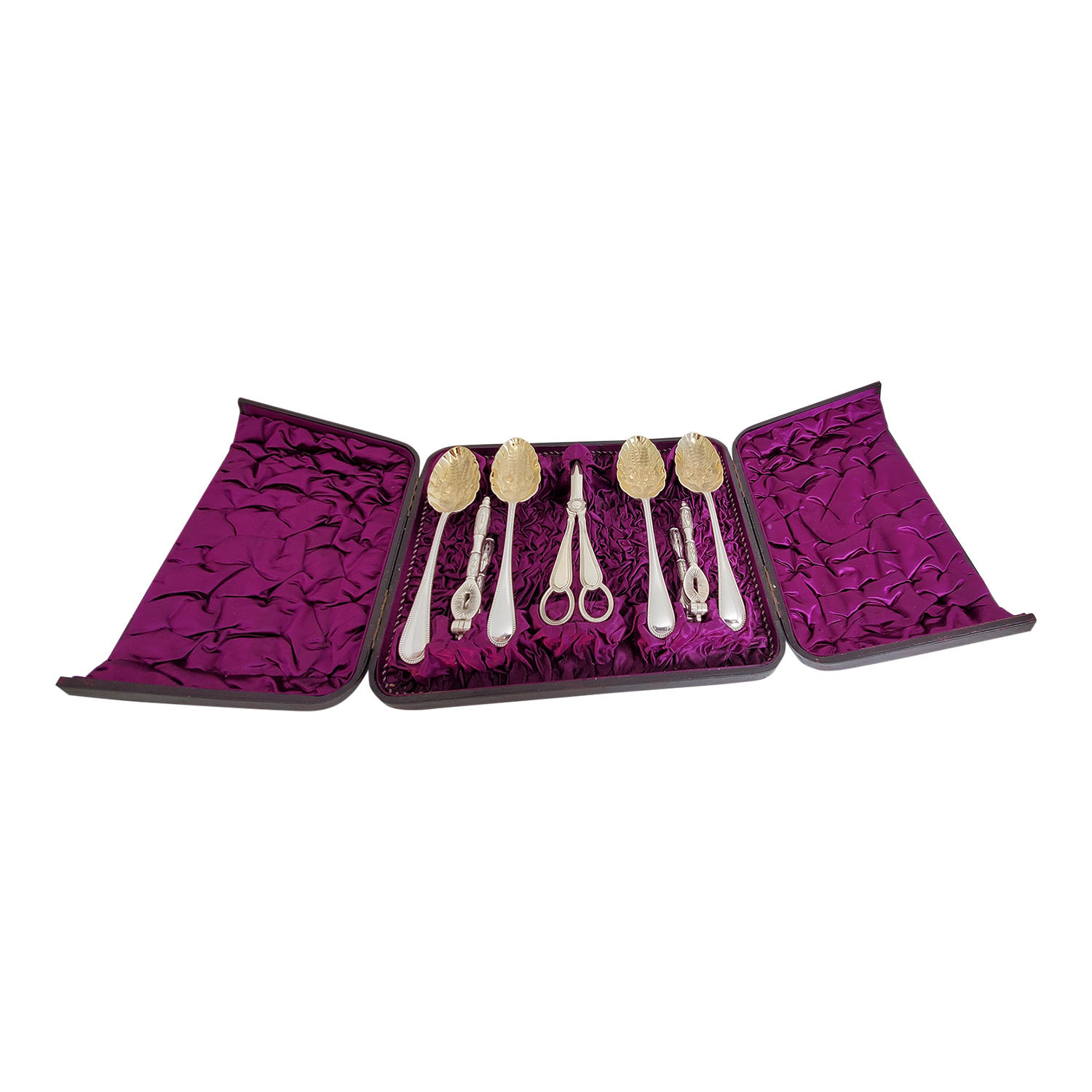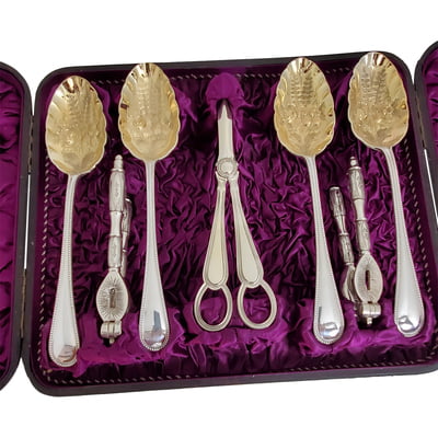 Fruit Set 4 Berry Silver Plate Spoons 2 Nut Crackers Pr Grape Scissors English Silver Plate c.1875