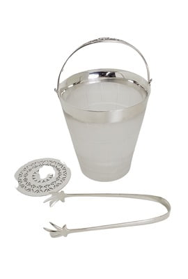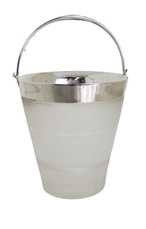 Frosted Glass Ice Bucket with Drainer & Tongs English Siver Plate c.1880 8" with Handle. SKU #: A1548.