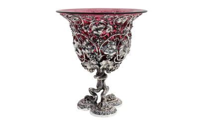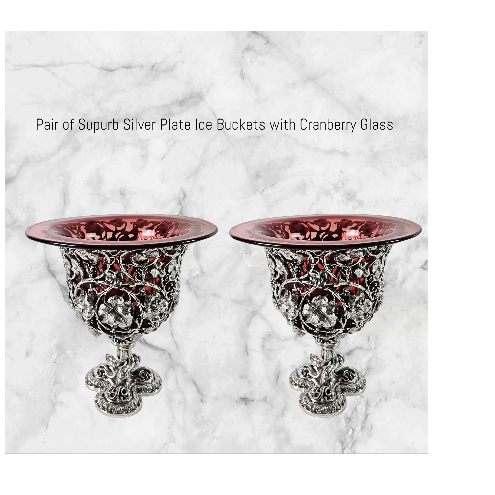 Exquisite Pair of Silver-Plated Ice Buckets with Cranberry Colored Glass Inserts Experience the pinnacle of craftsmanship with this exceptional pair of silver-plated ice buckets, featuring cranberry glass inserts and a design inspired by originals from circa 1850. Design Highlights: Fully pierced detailing with intricate patterns that showcase exceptional artistry. Resting on an elaborate trefoil-shaped foot, adding stability and timeless elegance. Each bucket stands 11 inches high with a diameter of 10 inches, offering impressive proportions and functionality. The warm tones of the cranberry glass inserts beautifully contrast with the gleaming silver plate, creating a striking visual appeal. These ice buckets are not only a functional addition to any elegant gathering but also a statement piece that embodies the luxury and refinement of 19th-century-inspired design.
