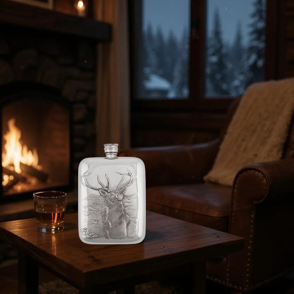 Stag Head Flask Pewter 6oz With Pouch & Box. SKU #: C1048.