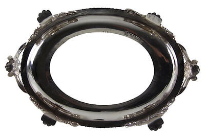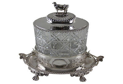 | Sterling silver and cut-crystal biscuit barrel, topped by a dairy cow. Egg and dart trim borders the framework and the hefty barrel is supported by paw feet. The hallmarks indicate that it was fashioned of solid sterling silver in London in 1869. Marked: |