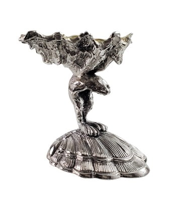 Salt Frog Standing on top of shell Bent Forward Holding an Oyster Shell Silver Plate