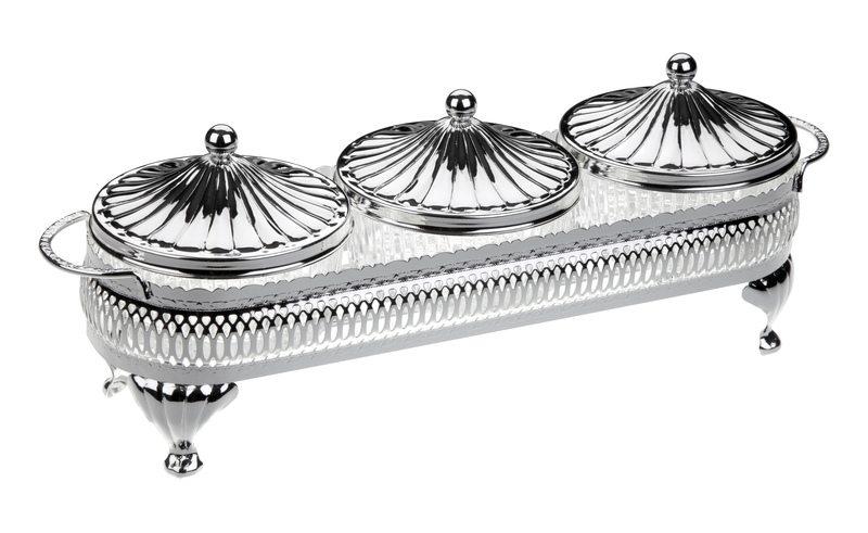 Queen Anne 3 Pce Round Party Set 5"h x 4 1/3"w x 12 1/2"l English Silver Plate (Tarnish Resistant). SKU #: 0/4923.