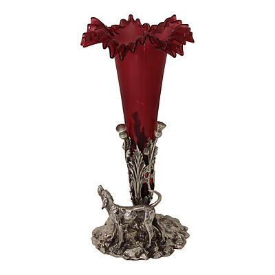 Vase Cranberry with Thistle and Hound Dog   Design Silver Plate