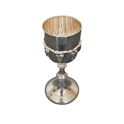 Elevate your collection with this exquisite Kiddish Cup, standing elegantly at 7 inches high. Crafted from high-quality silver plate, this piece is a testament to timeless craftsmanship and historical elegance. The cup is beautifully embellished with intricate hanging grape motifs, adding a touch of sophistication and charm. Perfect for ceremonial use or as a decorative piece, this Kiddish Cup is a unique addition to any collection. Its detailed design and fine craftsmanship make it a standout piece that will be cherished for generations.