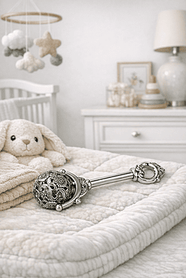 Victorian Copy Baby Rattle with Spinning Floral Patterned Filigree Ball English Polished Pewter 5".