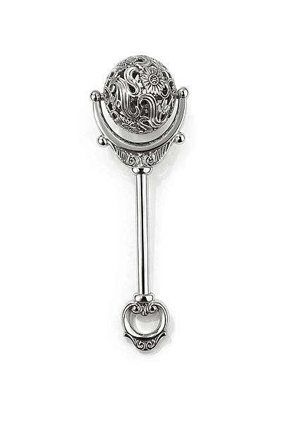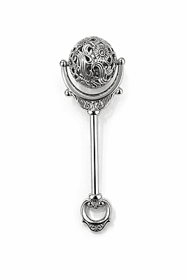 Victorian Copy Baby Rattle with Spinning Floral Patterned Filigree Ball English Polished Pewter 5". SKU #: C4600.