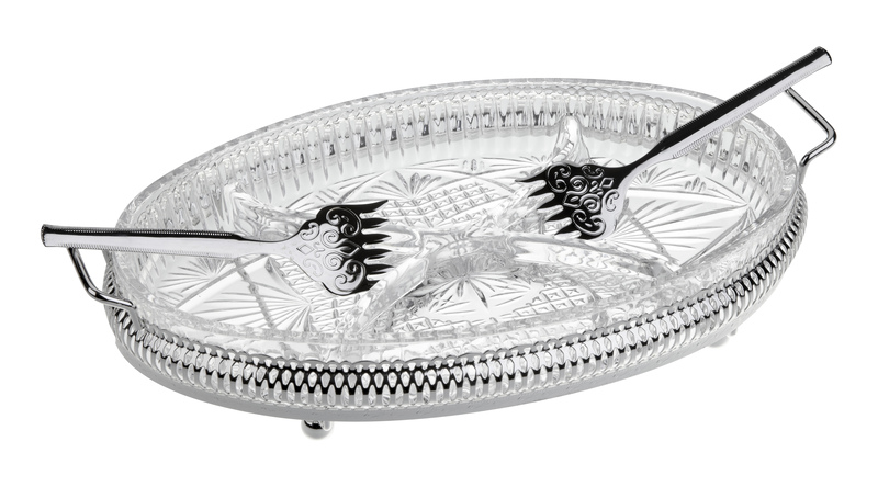 Silver Plated Gallery Frame with Side Handles and Ball Feet. 4 Division Oval Patterned Hors d'Ouevre Glass, and 2 Silver Plated Ornate Serving Forks 12 1/8" x 7 7/8" |