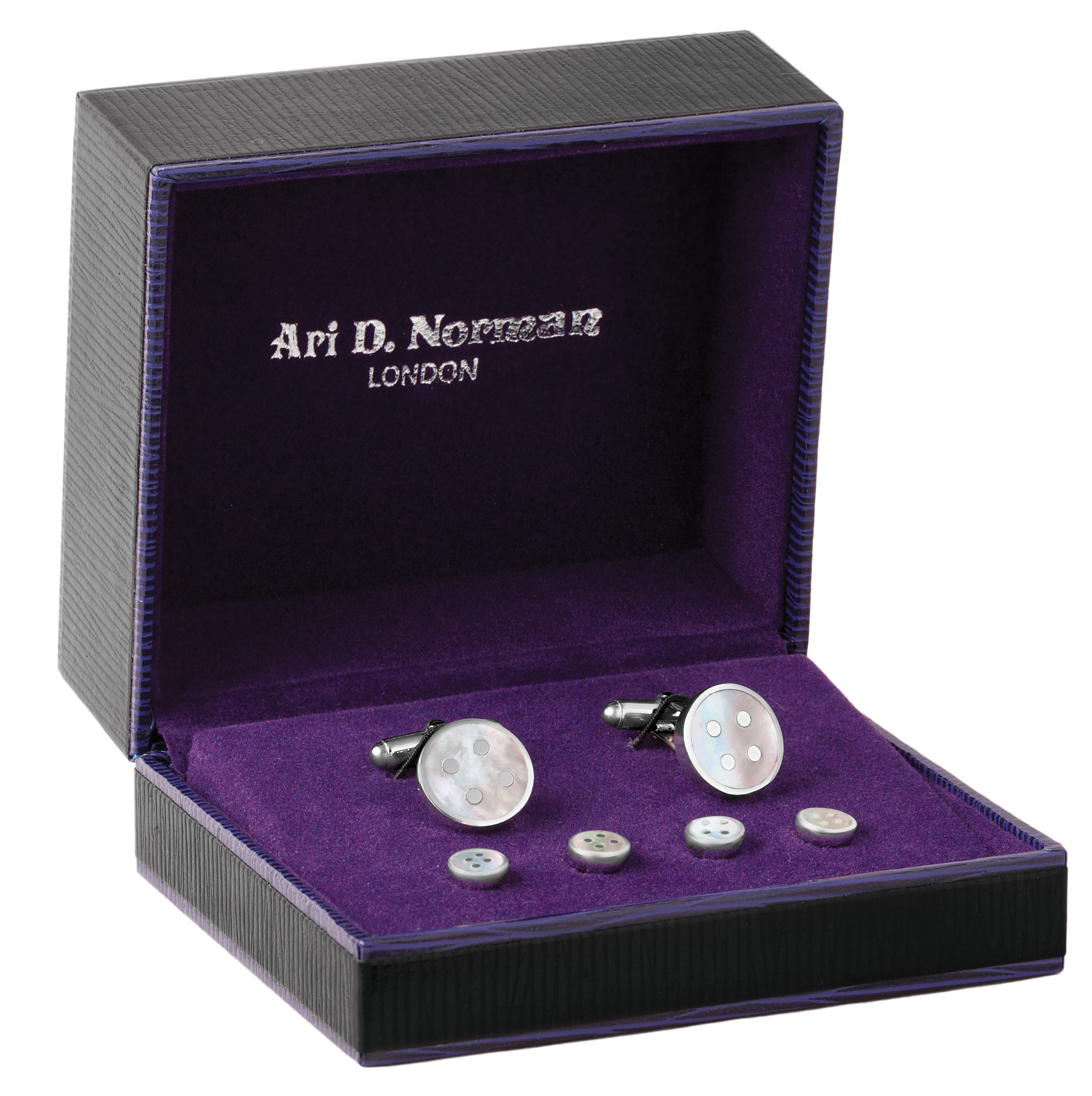 Hand finished and perfectly polished, Corbell only uses the finest traditions of British craftsmanship to Sell our products premium and collectible pieces of the future. This set of sterling silver mother of pearl cufflinks and stud set features a small mother of pearl button surrounded by sterling silver. Plain and simple, these button studs will complement any dress shirt for an evening out.