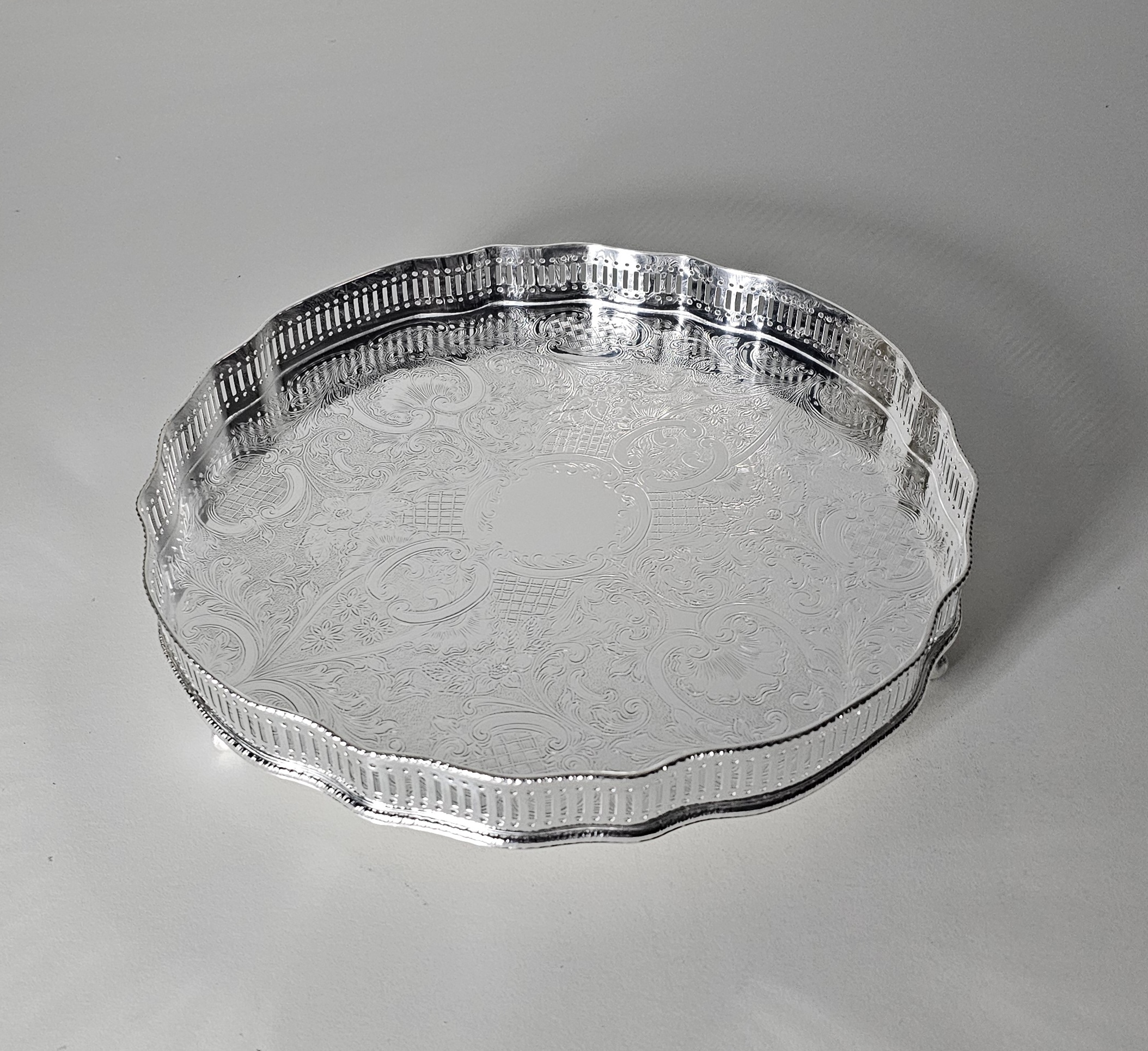 A fine example of traditional Sheffield silversmithing, this Round melon shaped gallery tray exudes classic charm and craftsmanship. Measuring 12" diameter and rising 2 inches high, it features a refined pierced gallery edge and rests on Ball & Claw feet—a hallmark of 19th-century design. The engraved surface adds elegance and character, creating a striking backdrop for drinks, desserts, or cherished heirlooms. Ideal for refined entertaining or as a sophisticated gift with timeless appeal.