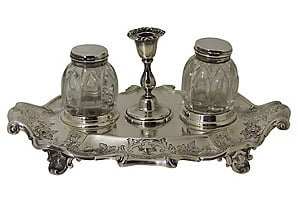 A charming and elegant lady's inkstand, incised floral motifs in the gondola tray, 2 hefty crystal inkwells with hinged lids, and a slim central chamberstick with delicate shaped edge. The workmanship in the delightful inkstand is that of the finest English silversmiths of the latter half of the 19th century and the condition is pristine.