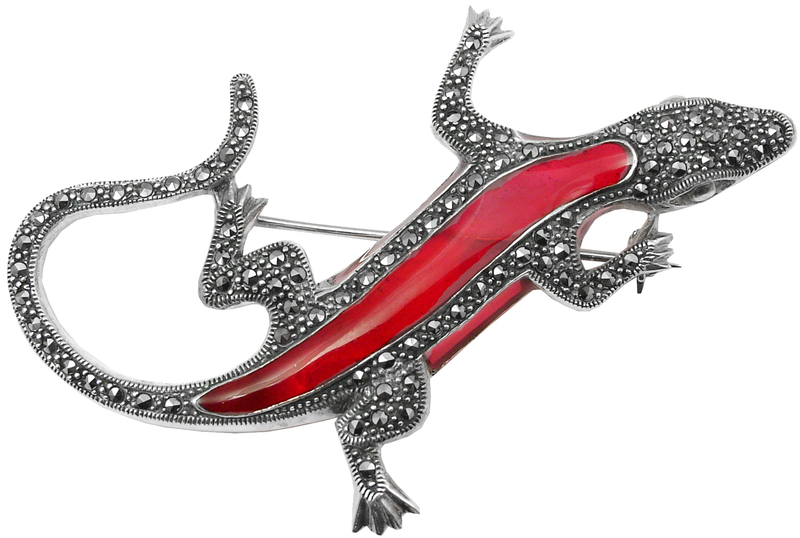 Brooch Lizard Design with Marcasite and Red Enamel Sterling Silver