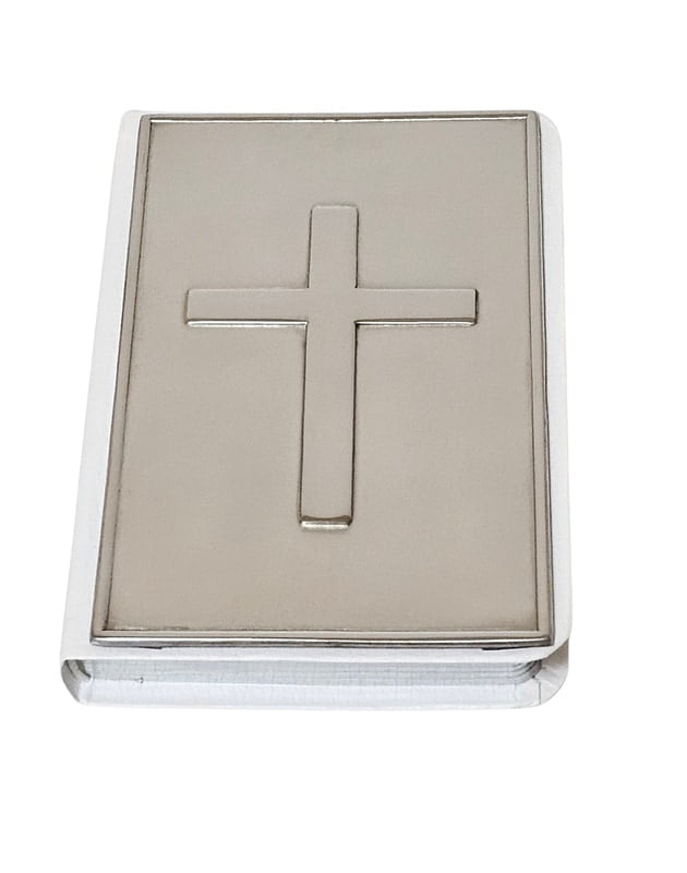 White Child's Size New Testament Bible With Engravable Pewter Cross Cover SKU:Bible11 White