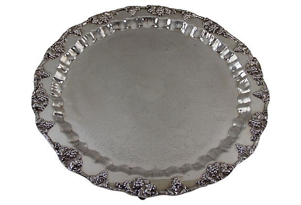 Large round silver-plate salver with engraved grapevine border and blank cartouche. Made in England, circa 1940.