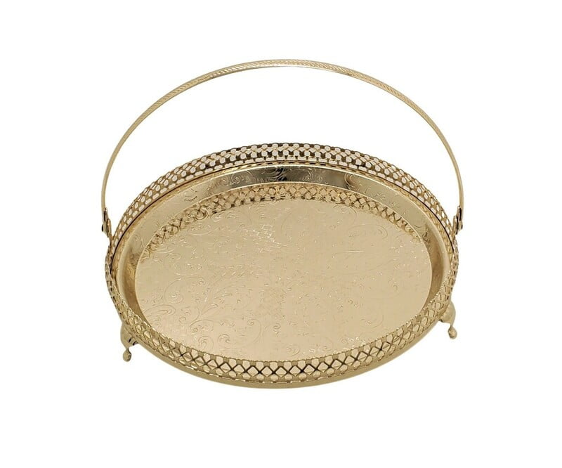 Silver Plated 9" Round Gallery Tray with Feet & Swing Handle Gold Finish
