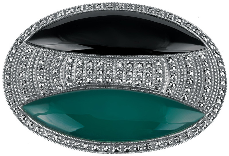 Brooch Oval Onyx, Green Agate and Marcasite English Sterling Silver 1 5/8" x 2 1/4"