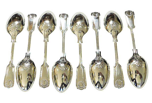 Set/8 Fiddle Thread & Shell Desert Silver Plate Spoons English Silver Plate C.1860