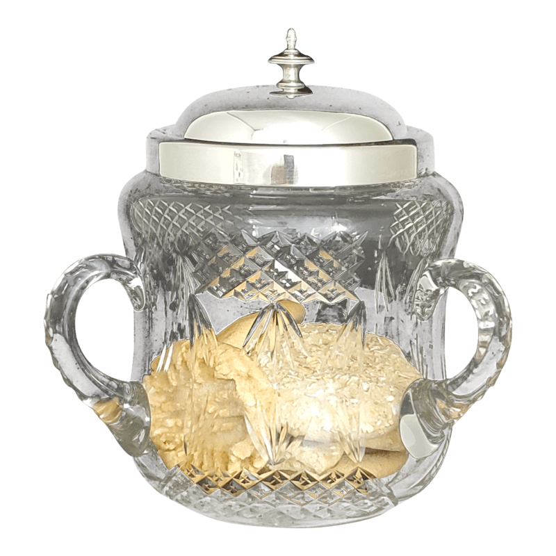 Three-handled crystal biscuit barrel with smooth silver-plate lid and delicately beaded finial with a tiny acorn tip. Mounts marked: K&P Silversmiths. Made in England circa 1885.