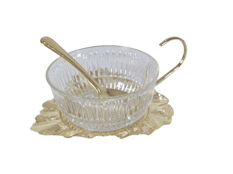 Queen Anne Leaf Jam Dish & Spoon – Gold Finish (Non-Tarnish) Elevate your table setting with the timeless elegance of the Queen Anne Leaf Jam Dish & Spoon. Crafted with a radiant gold finish that resists tarnishing, this exquisite piece blends classic charm with modern durability. The dish features a graceful leaf-inspired design, complemented by a matching golden spoon that nestles perfectly within the set.