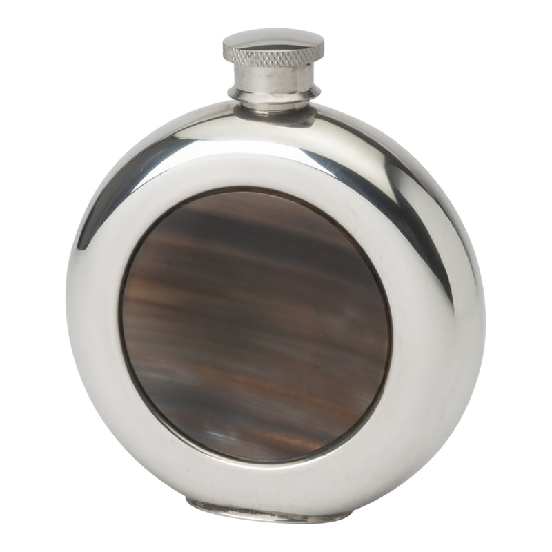 This is a Stylish Pewter flask made for Corbell.  It is a traditional round flask with a beautiful African Horn disk on the front with the maker's stamp underneath.   It comes in a black presentation box with a black drawstring microfibre bag for protection, this bag is useful after purchase for safekeeping and cleaning. The flask is individually hand made, and each one will vary slightly in color and streaks as it is genuine naturally shed horn, sometimes lighter.