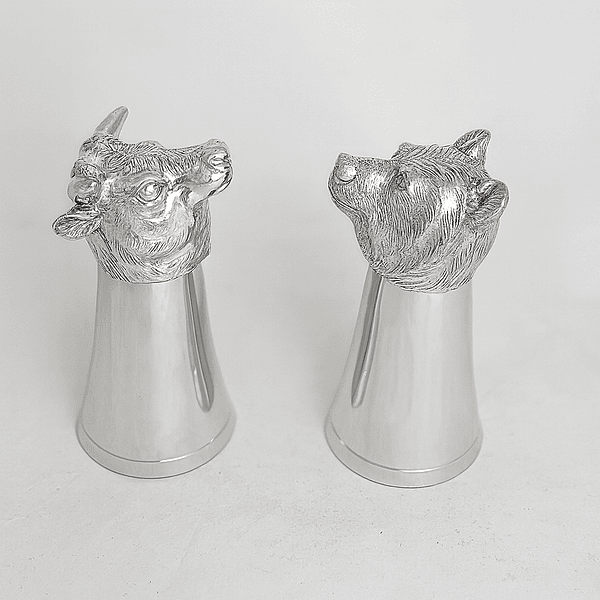 Bulls Head and Bears Head Pewter Stirrup Cup Jigger Set