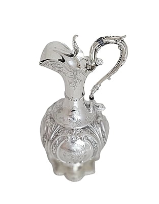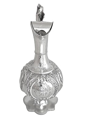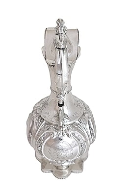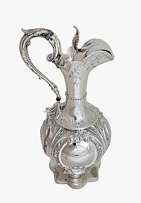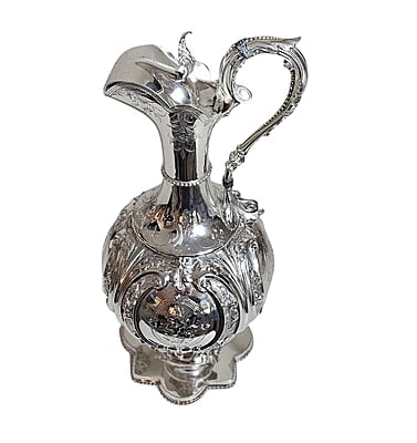 This exquisite silver-plated wine jug, dating back to circa 1860, is a magnificent example of 19th-century craftsmanship. The jug features intricate embossing with floral motifs and possibly heraldic emblems, adding a touch of elegance and historical significance. The elegantly curved handle and elaborate spout, adorned with leaf or vine designs, enhance its aesthetic appeal. The lid is topped with a figural element resembling foliage or a grape cluster, perfectly complementing the overall design.