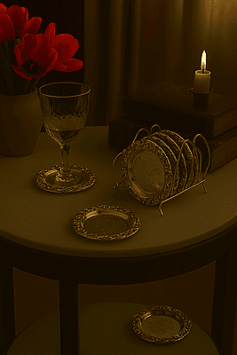 Queen Anne 6-Piece Coaster Set with HolderDimensions: Holder – 4½" L × 3⅜" W × 5" H Coaster Diameter: 3¾" Material: English Silver Plate, Tarnish Resistant (Gold Finish) This exquisite set includes six floral-edged drink coasters housed in a silver-plated holder with a radiant gold finish. Each coaster features a raised border of swirling vines and blossoms, framing a smooth center with subtle engraved detailing. The holder’s curved frame and rounded feet offer both elegance and practicality, keeping the coasters neatly stacked and easily accessible. Perfect for formal entertaining, gifting, or collector display, this set blends heritage charm with functional beauty. A refined accent for any bar cart, tea service, or tabletop. |