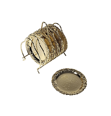 Silver Plated Holder with 6 Floral Edged Drinks Coasters. 6 Pce Coaster Set 4 1/2" x 3 3/8" x 5" (Coaster Diam 3 3/4) (Gold Finish)