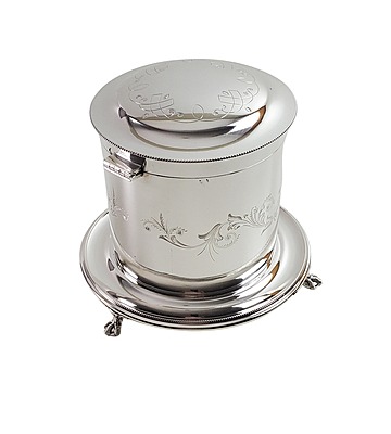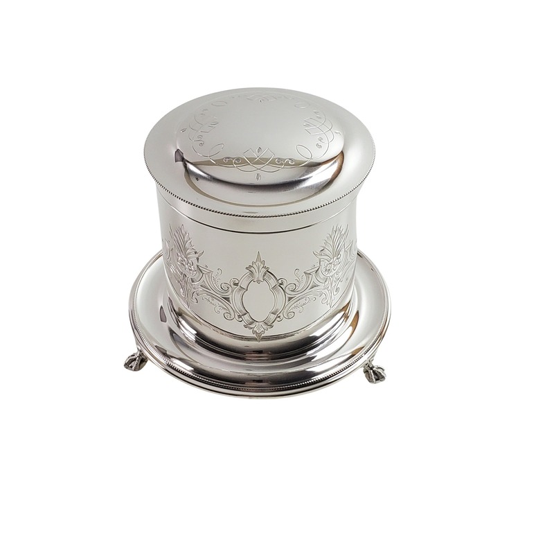 Biscuit Box Hand Engraved on 4 Feet English Silver Plate c.1875