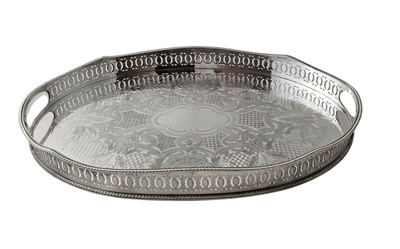 Oval Engraved 16" x 11.75" Gallery Tray With Inset Handles English Silver Plate c.1950