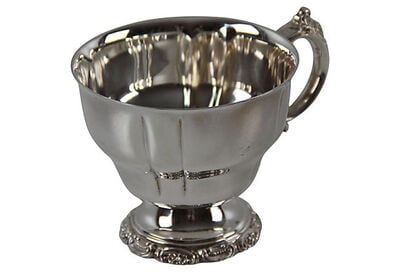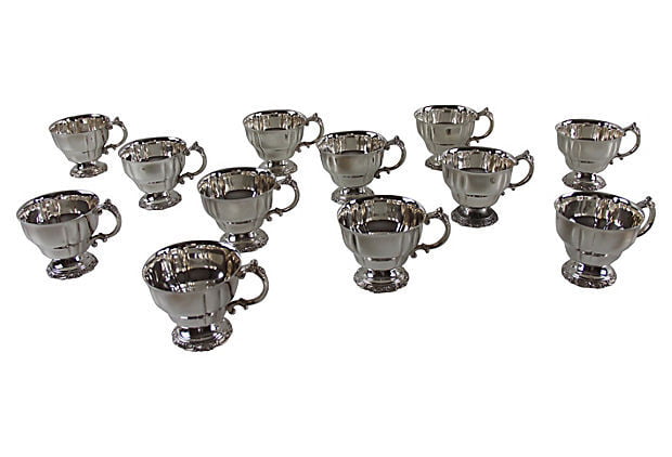 Set of 12 baroque-style Wallace silver-plate punch cups. Embossed sides with ornate handles and base edges. Made in England, circa 1940