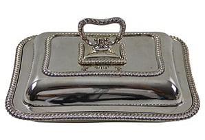 Rectangular entree dish with gadrooned edge and lid. Made in England, circa 1870.