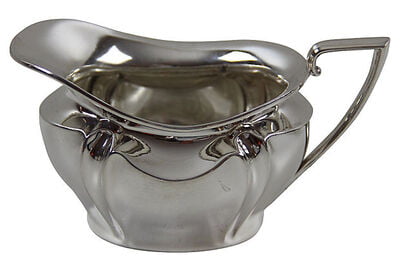 Silver-plate paneled open sugar bowl and cream jug made in England, circa 1885. Cream jug, 3"H; sugar bowl, 3.4"H.