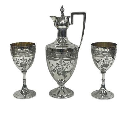 This exquisite pair of hand-engraved goblets, accompanied by a matching wine jug, is a testament to the skilled craftsmanship of English silversmiths circa 1865. Here’s a description for your website: