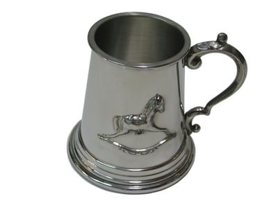 This charming pewter mug is designed for babies and young children. It features a shiny, reflective surface and a decorative handle with ornate detailing. The front of the mug is adorned with an embossed design of a rocking horse, adding a playful touch. The base of the mug is slightly wider than the top, providing stability. This mug is a perfect keepsake or gift for young children, combining functionality with a delightful design.
