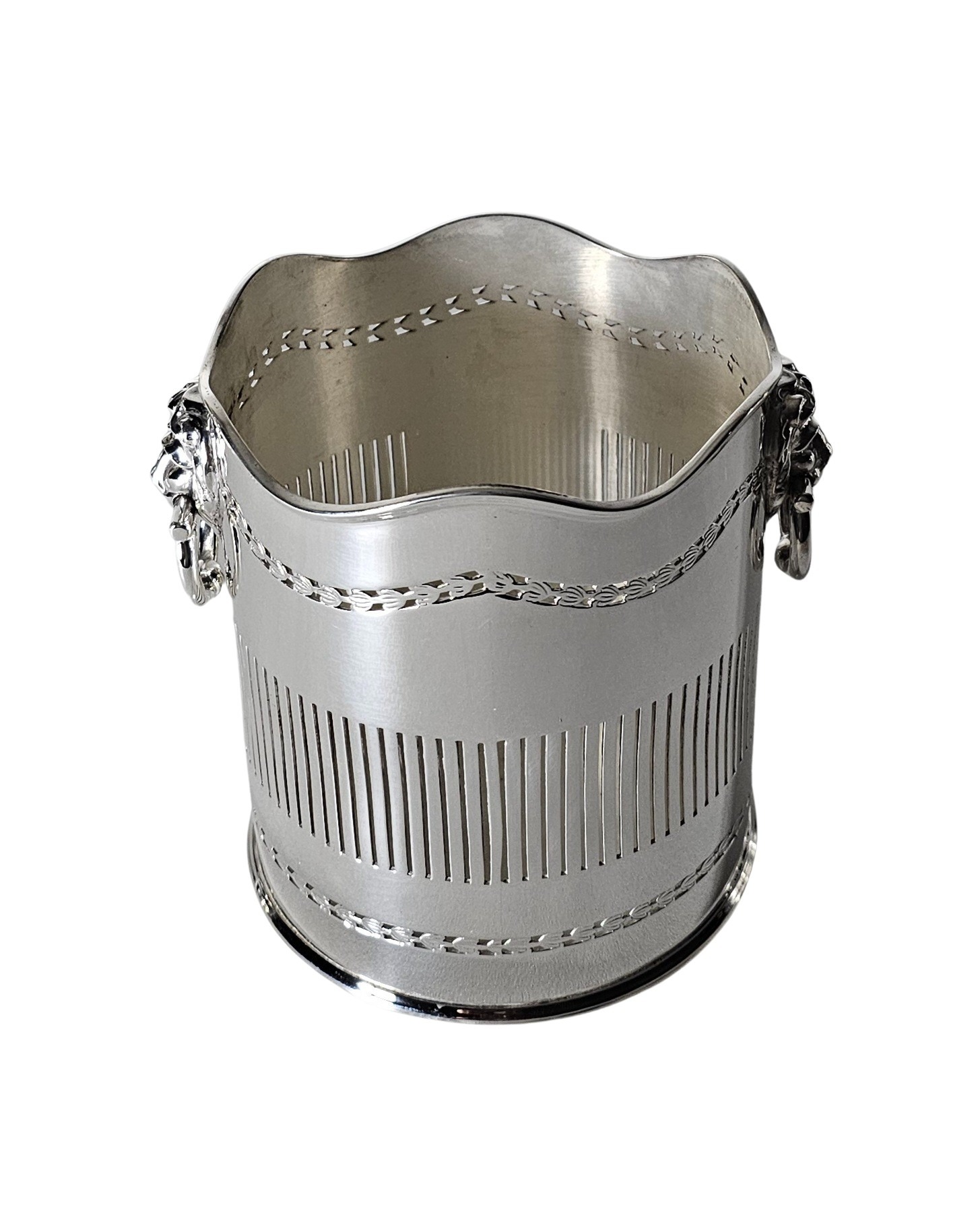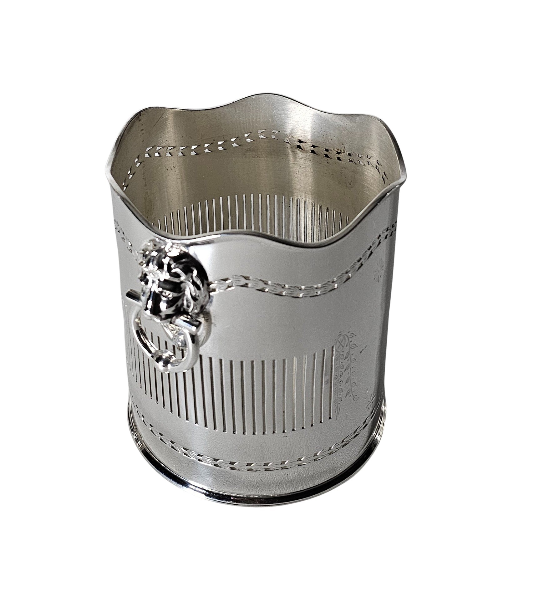 A silver plate syphon stand is a type of holder for a glass bottle that originally contained carbonated water or soda. Syphons were popular in the 19th and early 20th centuries as a way of dispensing fizzy drinks at home or in bars. A syphon stand is usually made of metal, often silver or silver plated, and has a circular opening at the top to fit the base of the bottle. The stand may have handles, feet, or a pedestal to make it easier to carry or display. The stand may also have decorative features, such as piercing, engraving, or motifs.