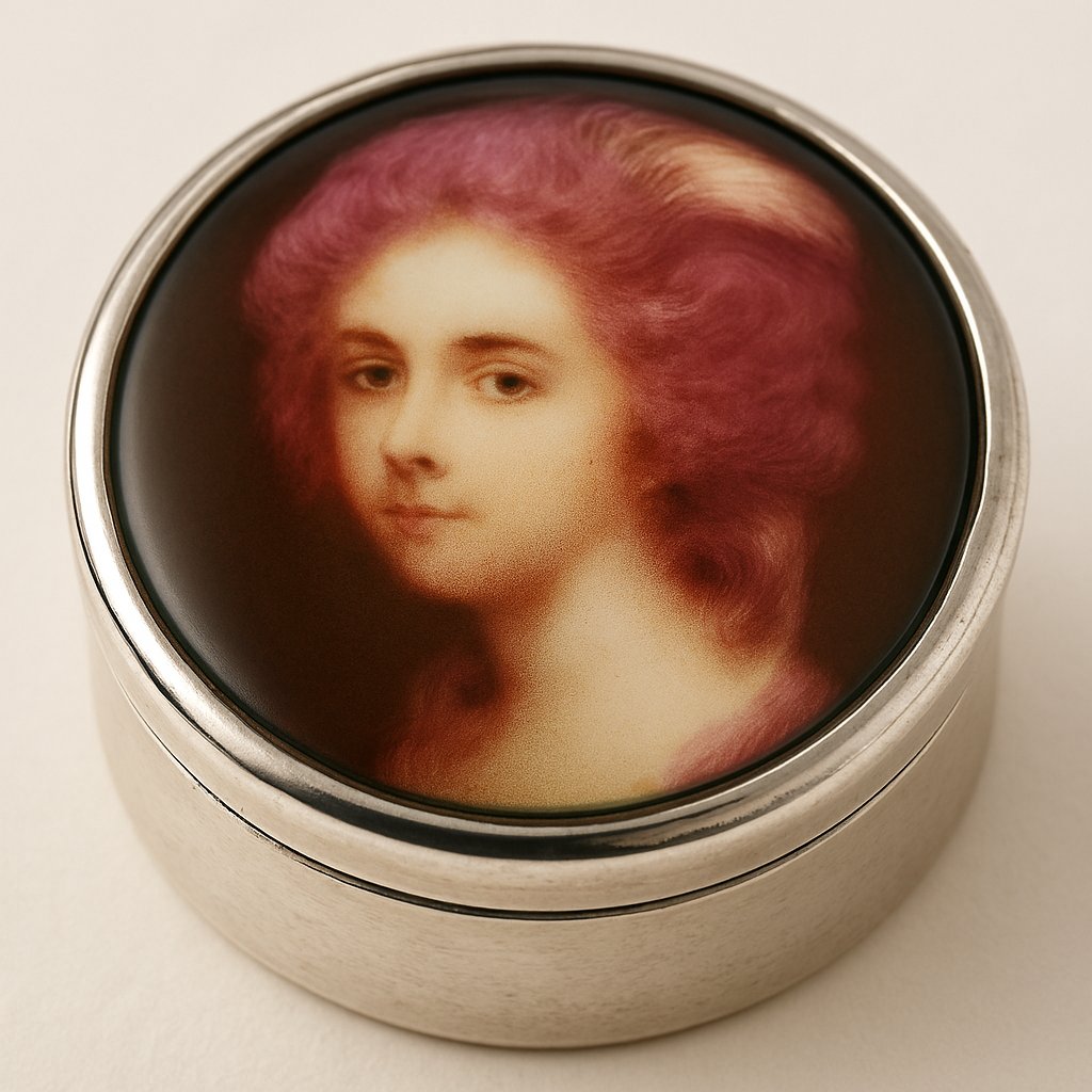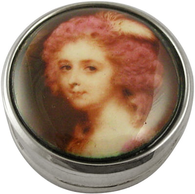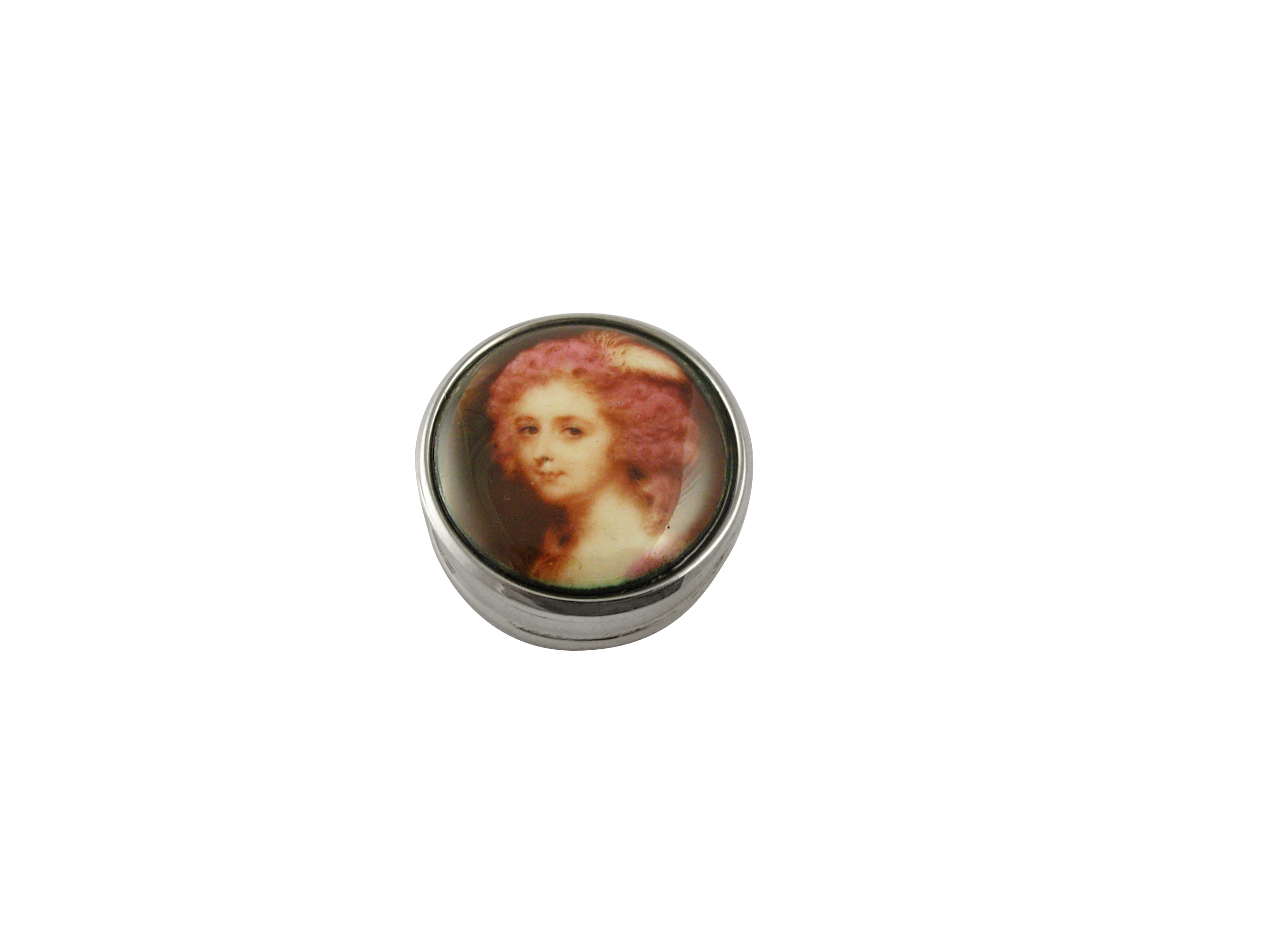Pillbox Lady Enamel Cameo Design 1" Diameter English Sterling Silver. (29 Available)SKU #: PB303.