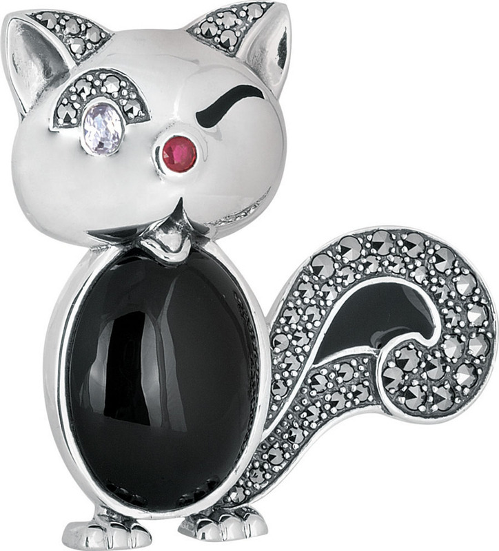 Brooch Cat Black Enamel, Red & Clear Crystal with Marcasite English Sterling Silver 1.75" x 1.5". SKU #: B525.