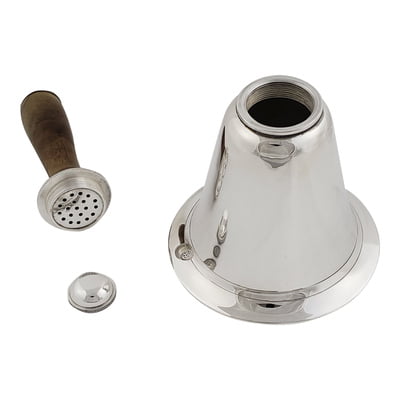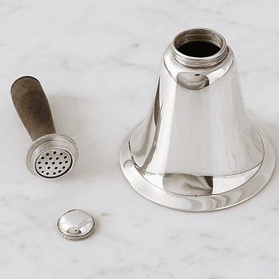 Inspired by a distinguished original, our Bell Cocktail Shaker is a faithful recreation in lustrous silver plate. This elegant piece separates into three precision-crafted components: the sculpted base, a refined wooden handle with a pierced strainer grill, and a gracefully curved cap for pouring.